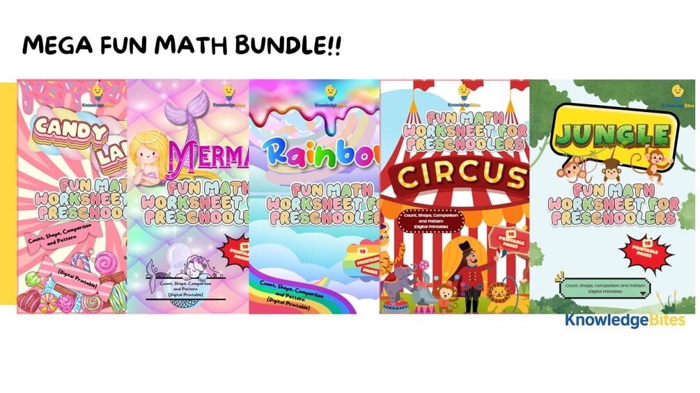 Math Activity Book Bundle for Kids | 5 Themes: Rainbow, Jungle, Candy, Mermaid & Circus | Printable Worksheets for Counting, Shapes, Comparisons & Patterns