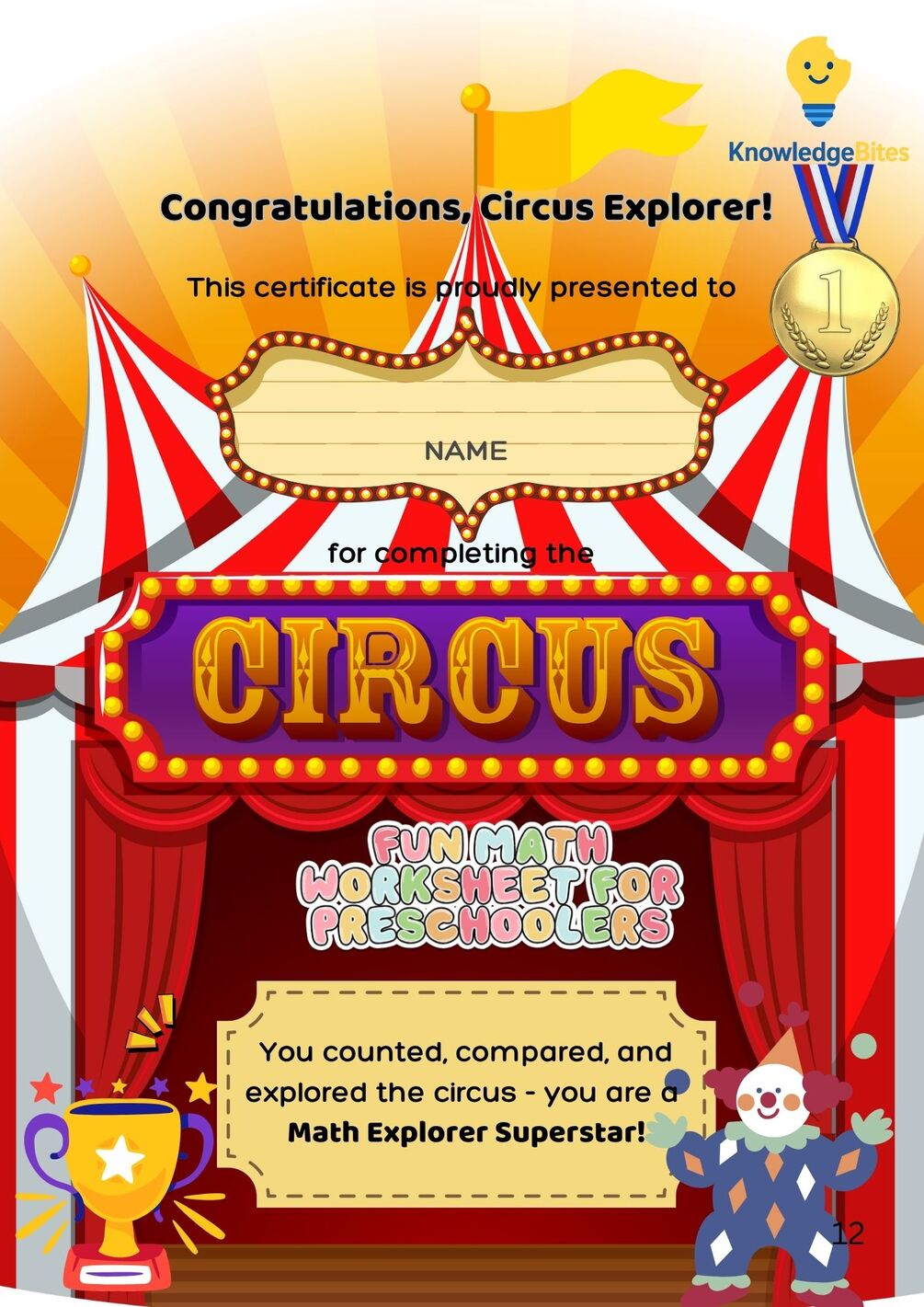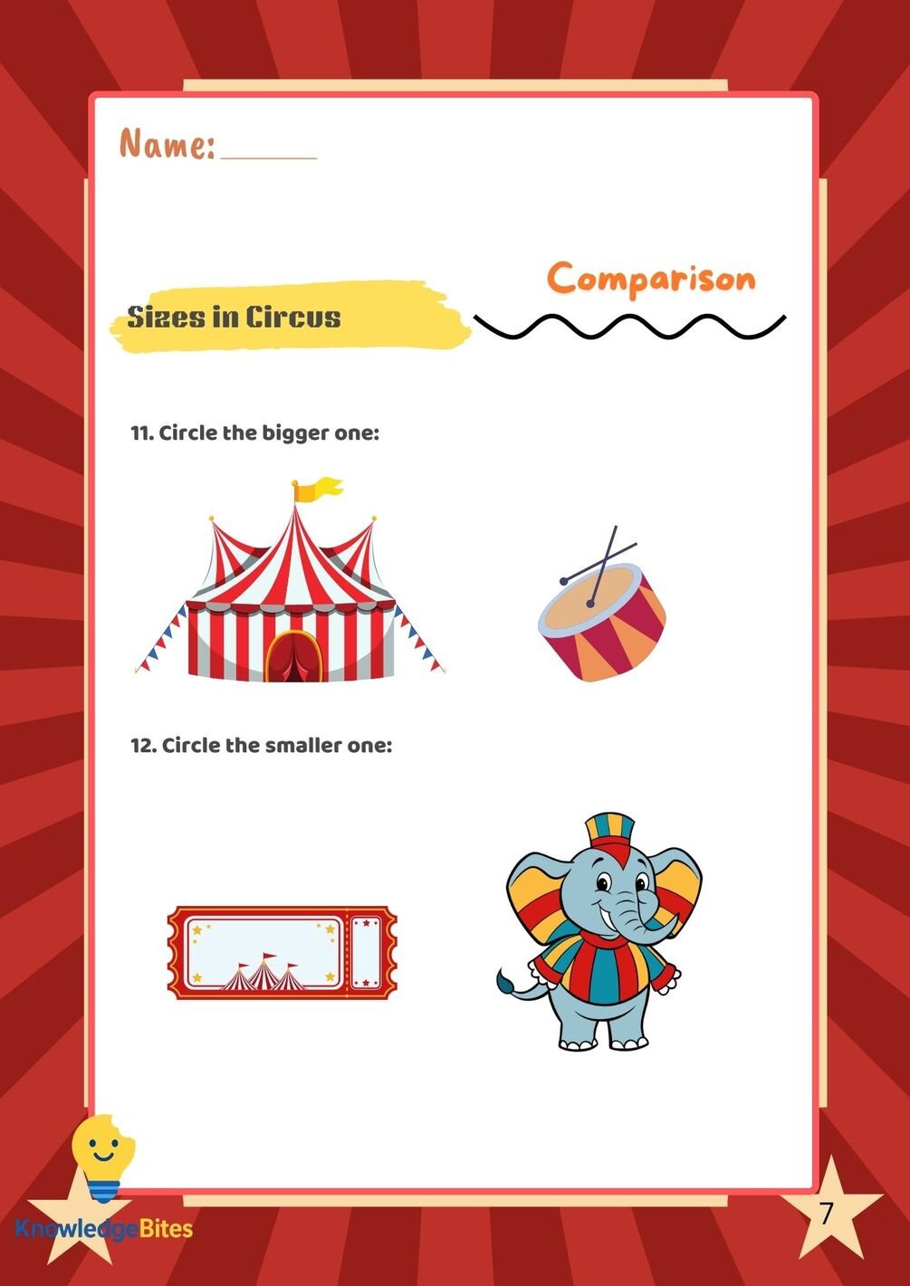 This printable workbook includes 10 colorful circus-themed math questions that help kids practice: