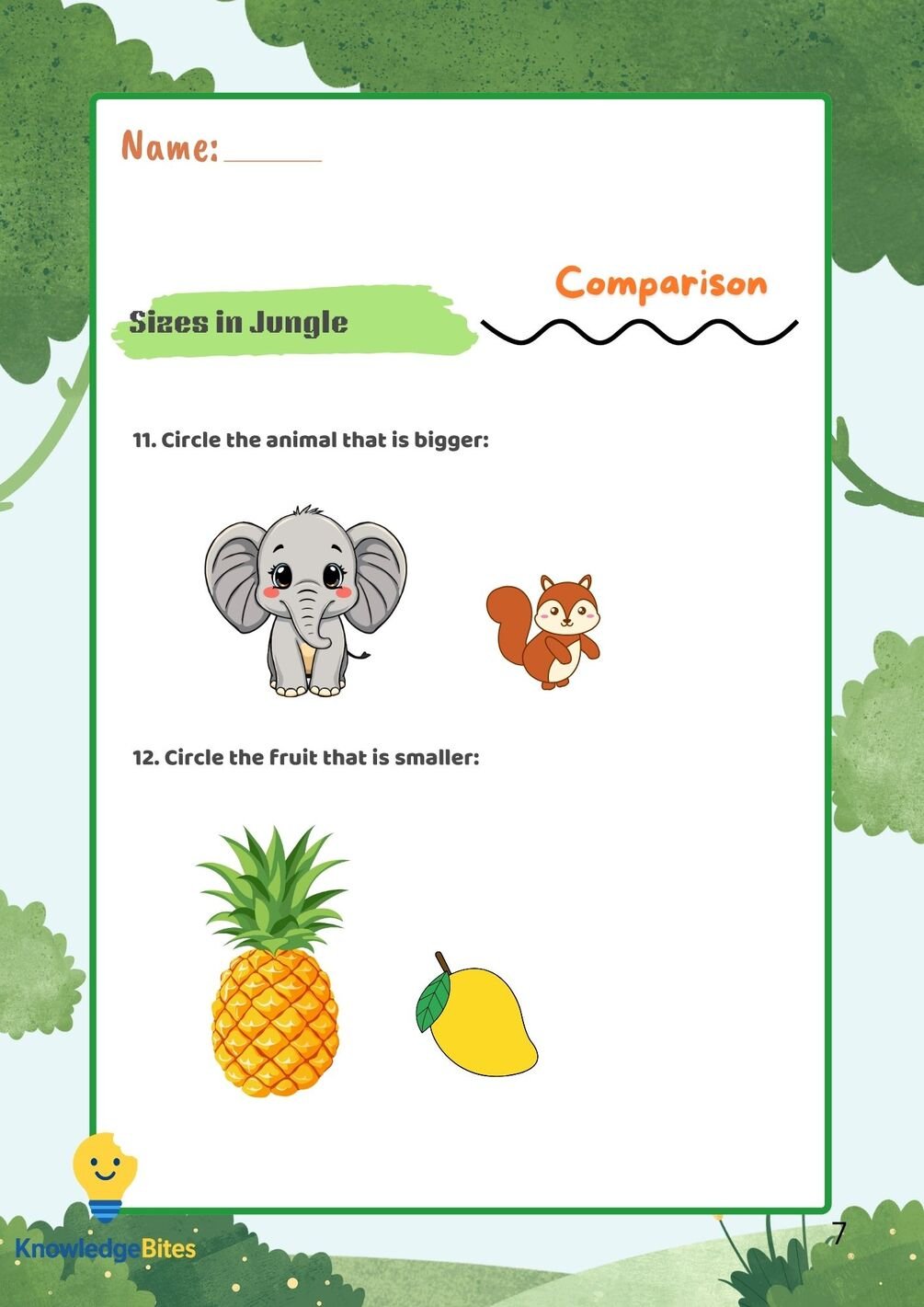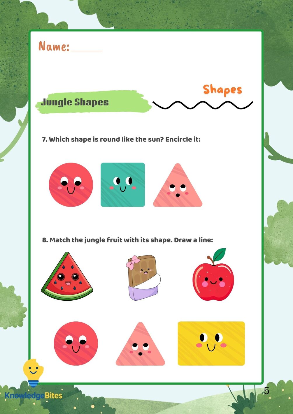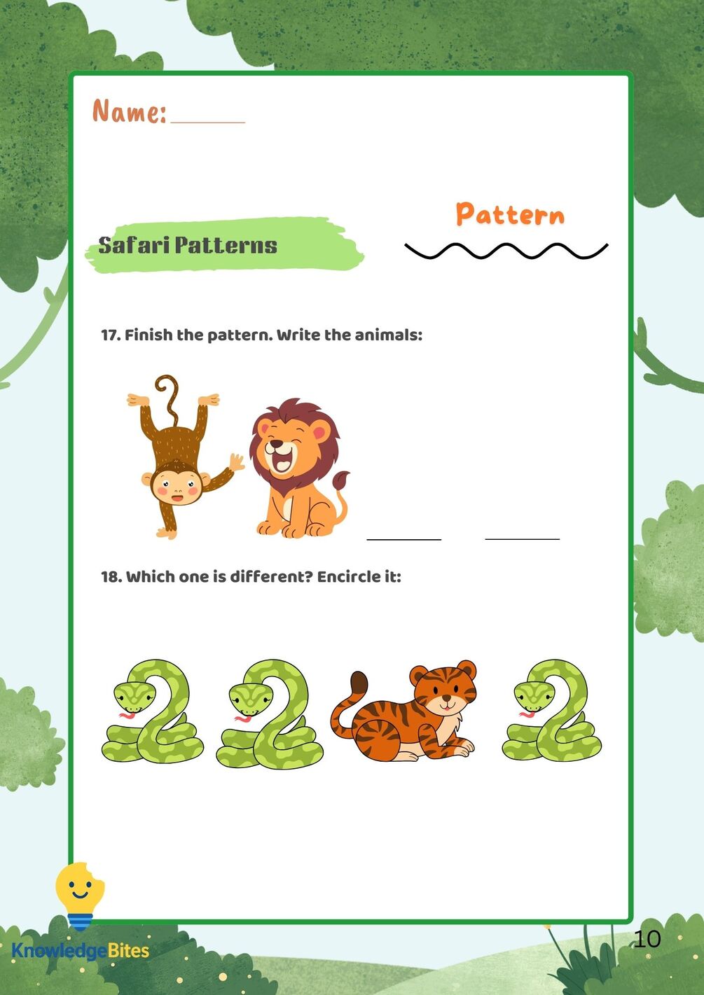 This printable workbook includes 10 colorful jungle-themed math questions that help kids practice: