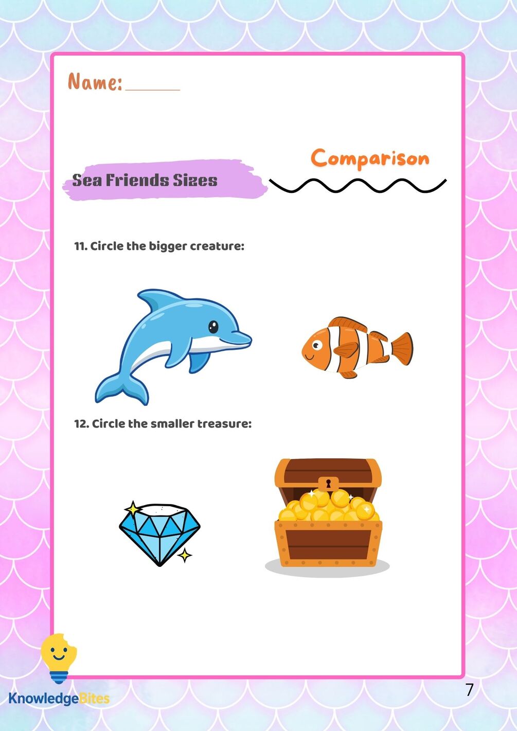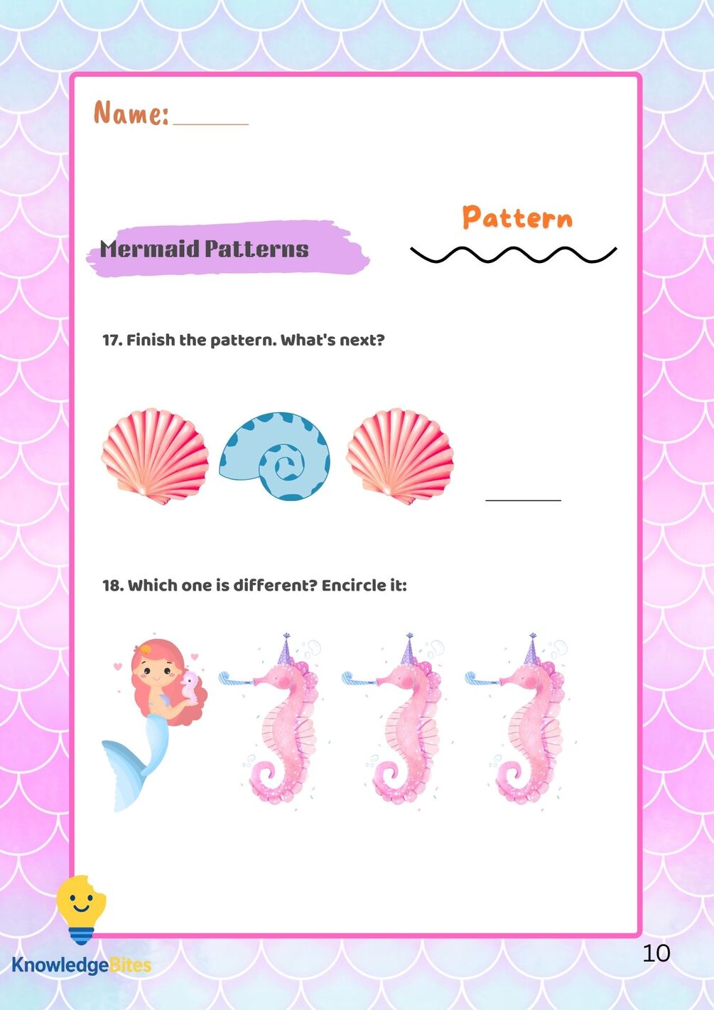 This printable workbook includes 10 colorful mermaid-themed math questions to help kids practice: